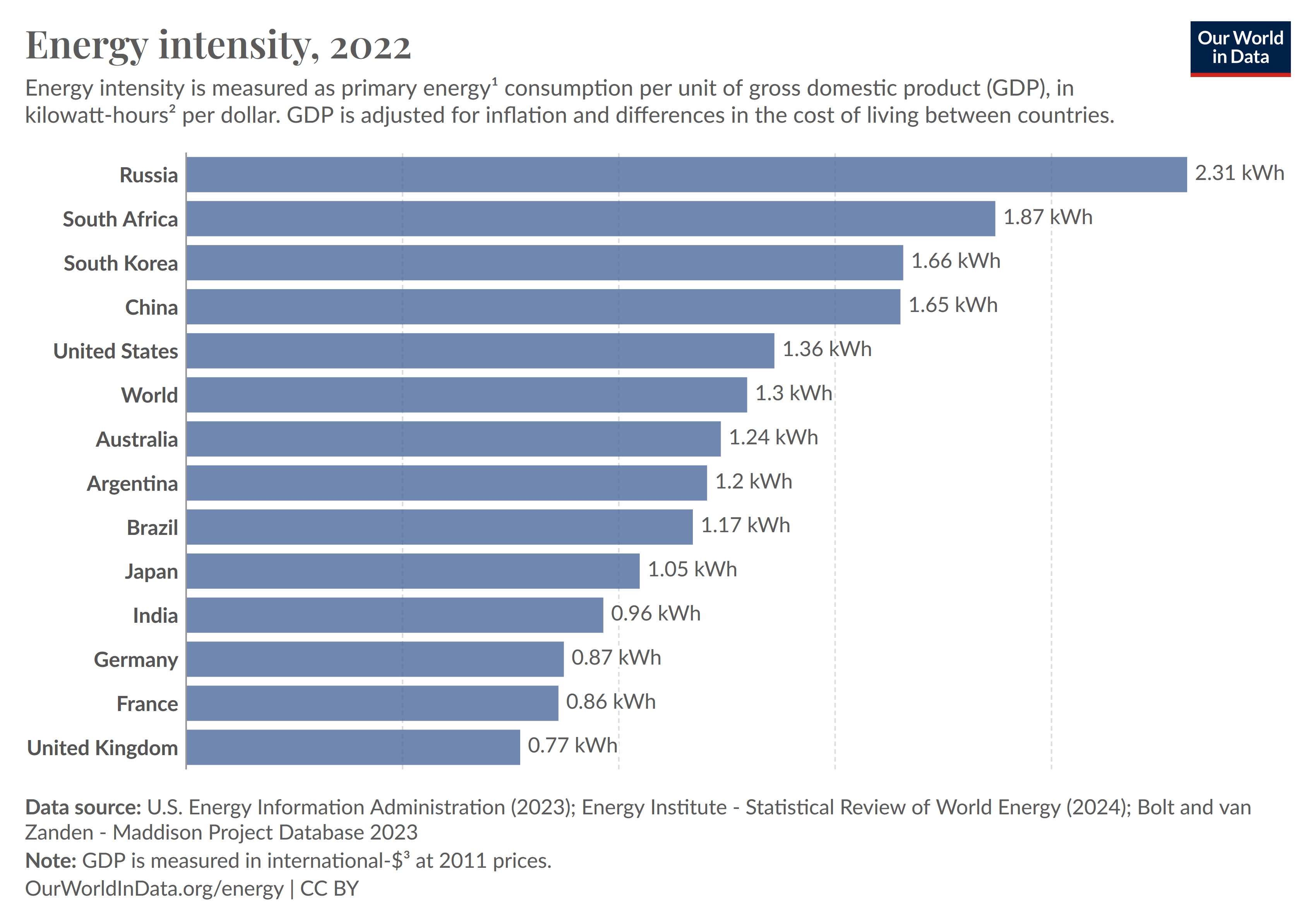 Energy-poor European countries are less energy intense, as indicated by low energy consumption relative to GDP (Fig. 5). North America is close to the world average, while energy-rich Russia or production rather than service-oriented economies like China need not or cannot care so much about energy intensity.