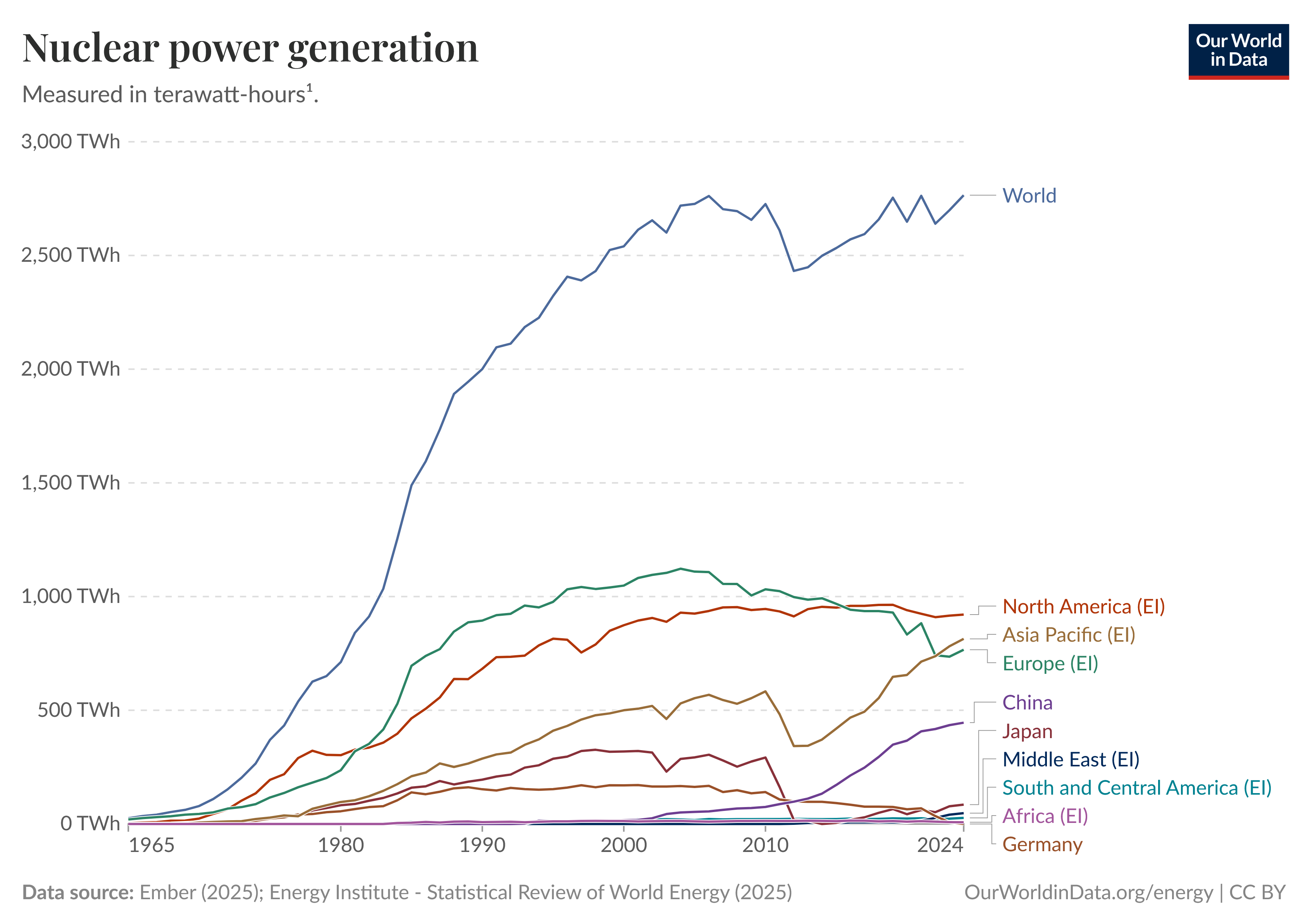 Since 2000, nuclear power generation has remained more or less constant (Fig. 11). A sharp increase in China compensated a slight decline in Europe. This decline is due to Germany, which did completely shut down all nuclear power plants.