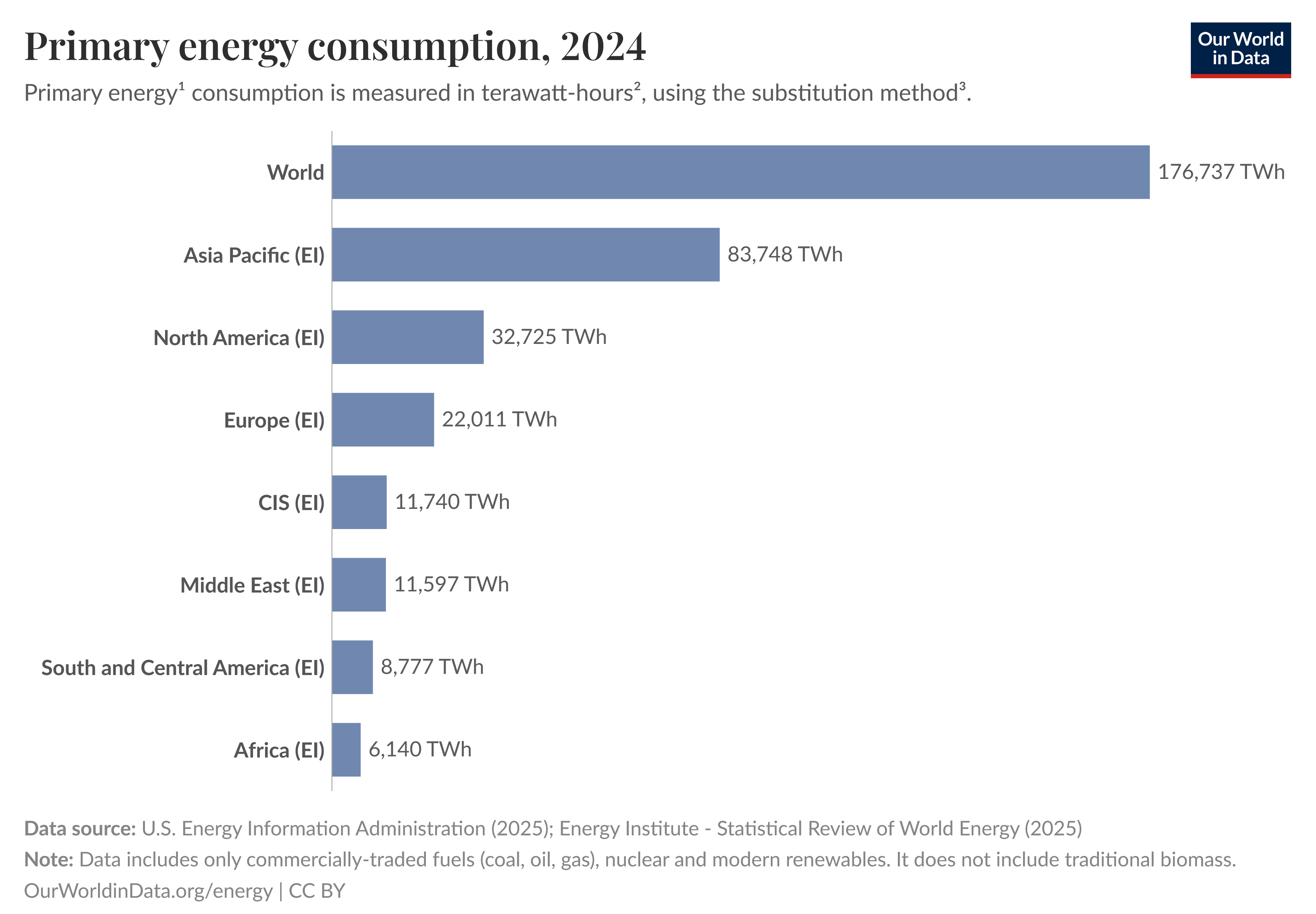 The Energy Institute (energyinst.org) does publish an annual statistical review of the world's energy production and consumption. The 2025 edition (with data for year 2024, graphics by ourworldindata) contains some interesting facts: