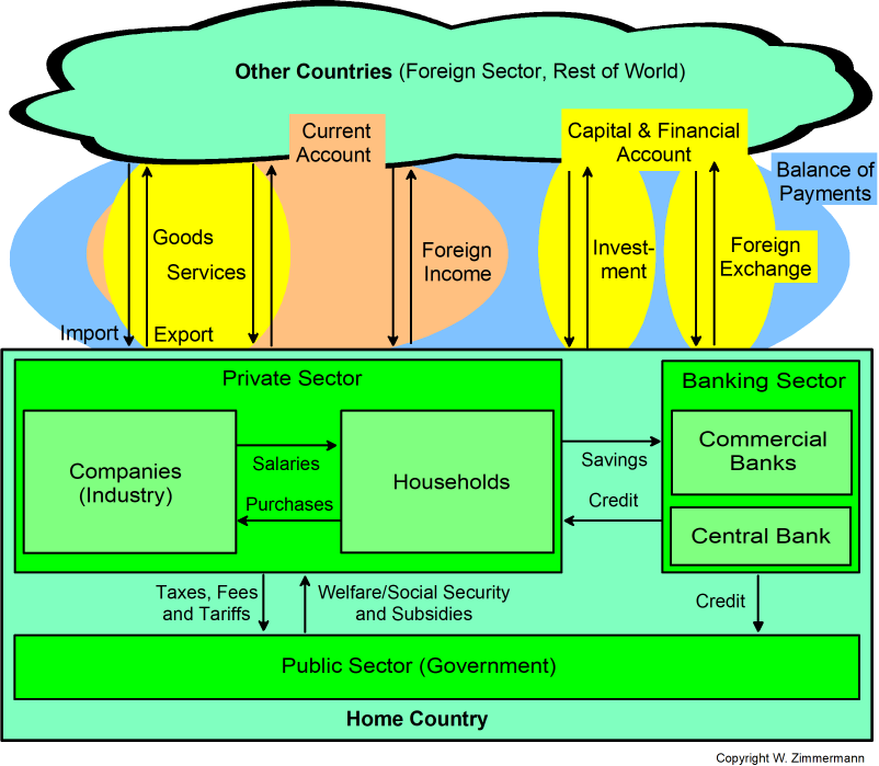 Each country interacts with other countries via trade and financial transfers. So we have a fifth actor, sometimes called the foreign sector.