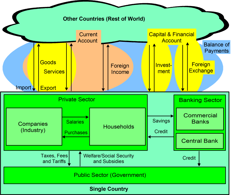 In times of growing economic uncertainty, trade wars, and tariffs, everyone should have a basic idea of how the economy and economic accounting work [ref. 2, 3]. Within each country, we basically have four major economic actors (Fig. 1):