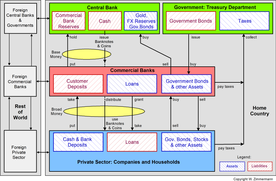 - At the top of the structure is the central bank (FED, ECB, ...), which issues the country's official cash (banknotes and coins) and implements its monetary policy to ensure the stability of the country's currency. In theory, the central bank is independent. But in most countries, their heads and boards of directors are appointed by the government and thus act in close cooperation with the Treasury Department (Ministry of Finance, Finanzministerium) and their fiscal policy. Central banks hold assets such as gold and government bonds to back the financial system. The central bank's foreign exchange (FX) reserves are usually held in the form of foreign government bonds.