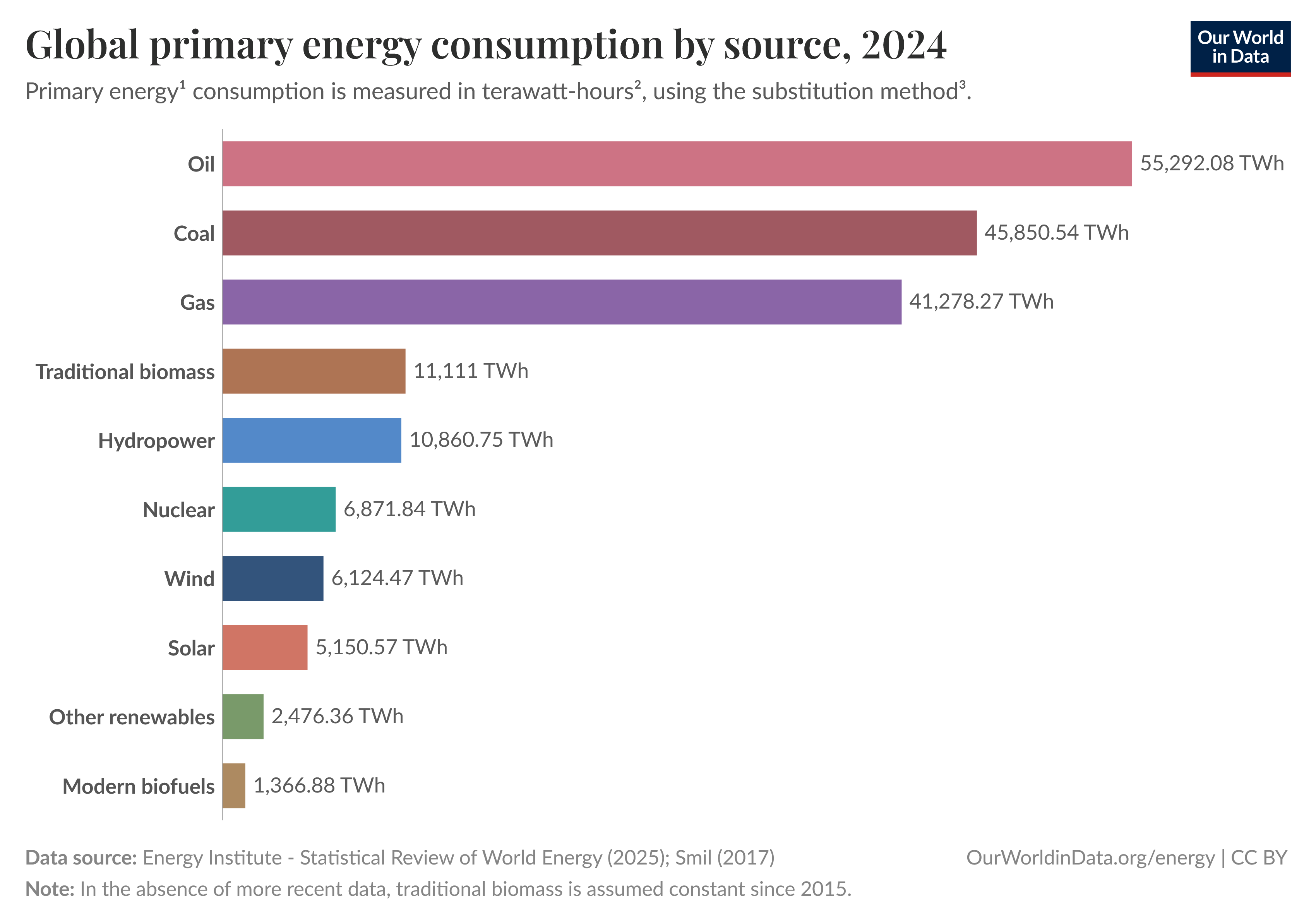 The world consumed ≈ 177 000 TWh of primary energy in 2024. Oil, coal and natural gas are the dominant sources (Fig. 1). CO2-free sources such as solar and wind ("renewables"), bioenergy, hydro- and nuclear power delivered less than 20% (for the statistical methods used see the note below).